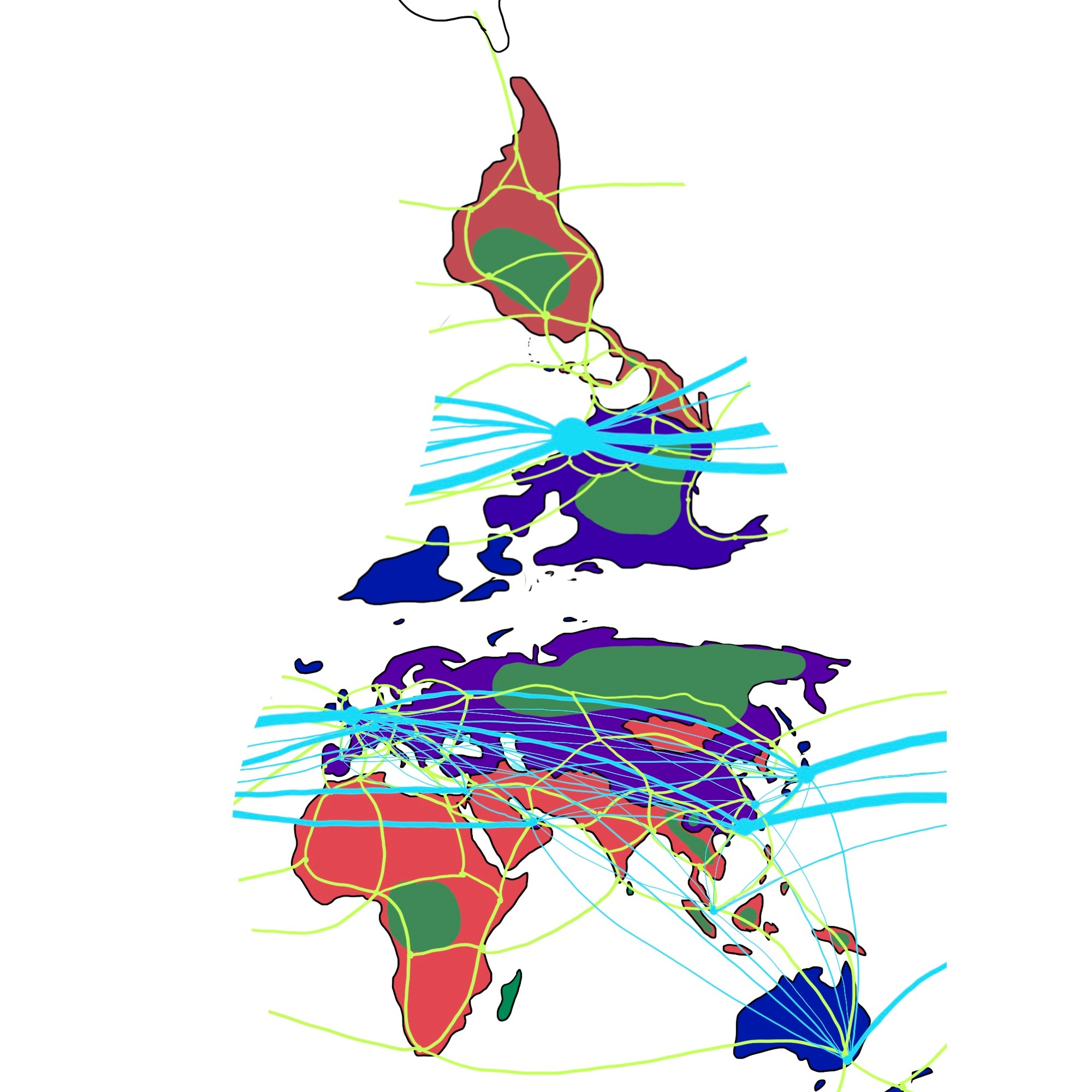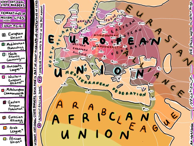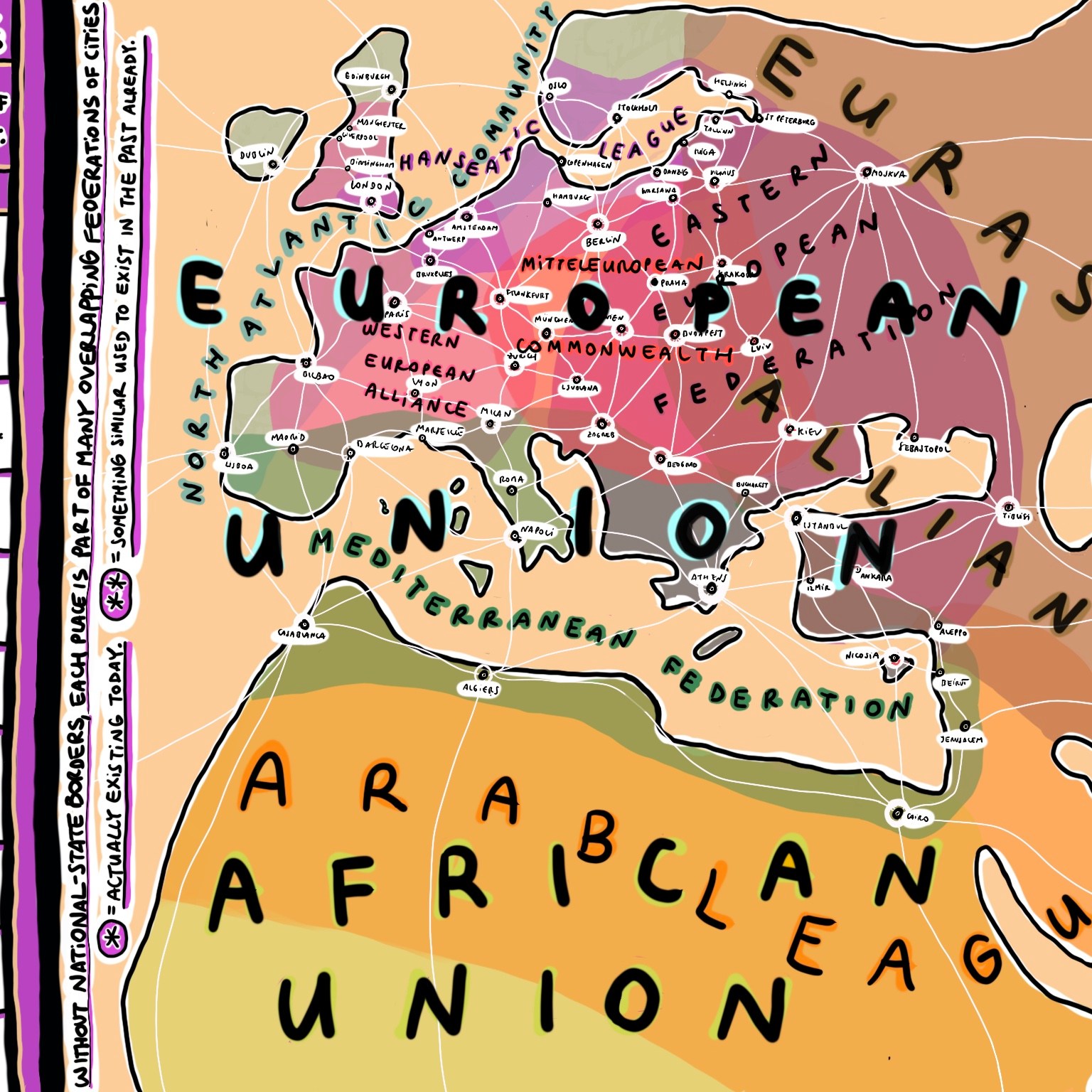 Every place comes together at the unique intersection, beyond borders, of many different histories (of people, of animals, of objects, of commodities, of knowledge, of power…). To think beyond national and “continental” borders, I made this map to play with the idea of overlapping federations (of which the EU would be just one).