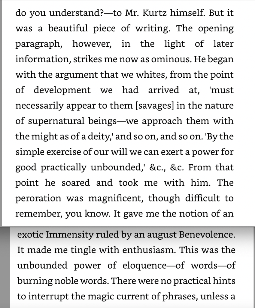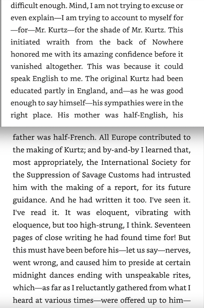 In the book, Conrad imagines the main character to tell the story of his travels to Belgian-colonized Congo, and his encounter with Kurtz, a European administering parts of the colony, in the interior, up the river Congo, in the heart of “darkness”, from a European perspective. Conrad, a Polish-British writer, had actually himself traveled to Congo, and this is a way for him to recount what he saw.